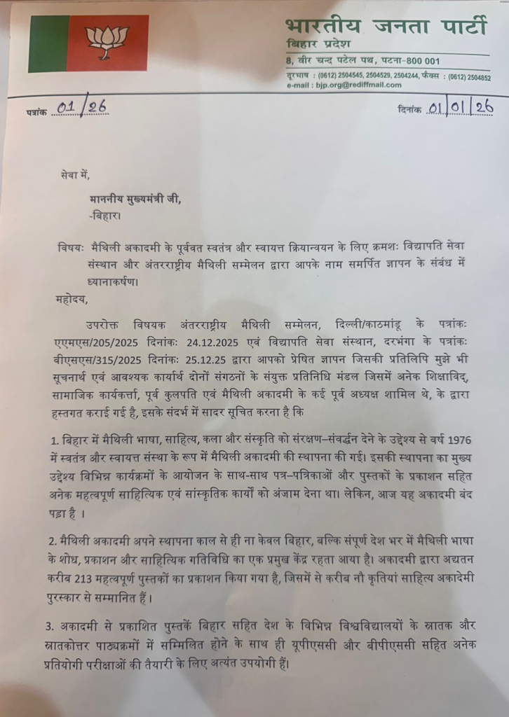 भारतीय जनता पार्टी, बिहार प्रदेश के अध्यक्ष श्री संजय सरावगी ने मैथिली भाषा, साहित्य और संस्कृति के संरक्षण एवं संवर्धन के उद्देश्य से माननीय मुख्यमंत्री श्री नीतीश कुमार जी को एक पत्र लिखकर मैथिली अकादमी को उसके पूर्ववत स्वतंत्र एवं स्वायत्त स्वरूप में सशक्त करने का आग्रह किया है।